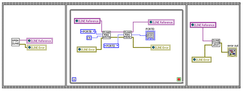 Writting simple VI's that use the PIC is fairly straight foward. Once the ZLINE session is open, its as simple as writting to or reading from a register. Instead of needing to know the memory address of the needed register, an enum is used that lists the registers. More complex VI's can be created from these for doing operations such as using the PIC's A/D or PWM modules.