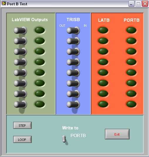 Currently there is one potential issue I have found. There is a fairly large delay between when a VISA write is performed and then a read. Everytime a register write is performed, the PIC replies with an acknowledge that lets LabVIEW know that the PIC is still running and that the command was received correctly. To measure the possibly output speed of the system, I had LabVIEW toggle a bit on PORTB in a loop with out any kind of delay or other LabVIEW code. The frequency of the output was around 250hz, which is a lot lower then I had hoped. If I had the LabVIEW code build up a large string that corresponded to the the command and data to perform the toggle and sent it, the frequency was over 1KHz (what it was exactly I can't remember). This brings me to the conlusion that for any operations needing to be done at a rate over 250hz, a sample will need to be created in the form of a single string of commands and sent. This would be similar to how NI's own DAQs function in that everything is a finite sample size.
